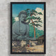 The Great Buddha at Kamakura, also known as the Kamakura Daibutsu, is a monumental sculpture that was depicted in a print by the renowned Japanese artist Kawase Hasui. The print captures the awe-inspiring grandeur of the Buddha statue, which stands at an imposing 13 meters in height and is made of bronze. The statue is situated in the city of Kamakura, which is located in the Kanagawa prefecture of Japan. Hasui's print is a masterful representation of the statue's majestic presence, with the Buddha's serene and contemplative expression evoking a sense of tranquility and reverence. The print also showcases the lush foliage that surrounds the statue, adding to its ethereal and idyllic ambiance. The Great Buddha at Kamakura is considered to be one of the most iconic and revered symbols of Japan's rich cultural heritage and is a must-see for any visitor to the country.